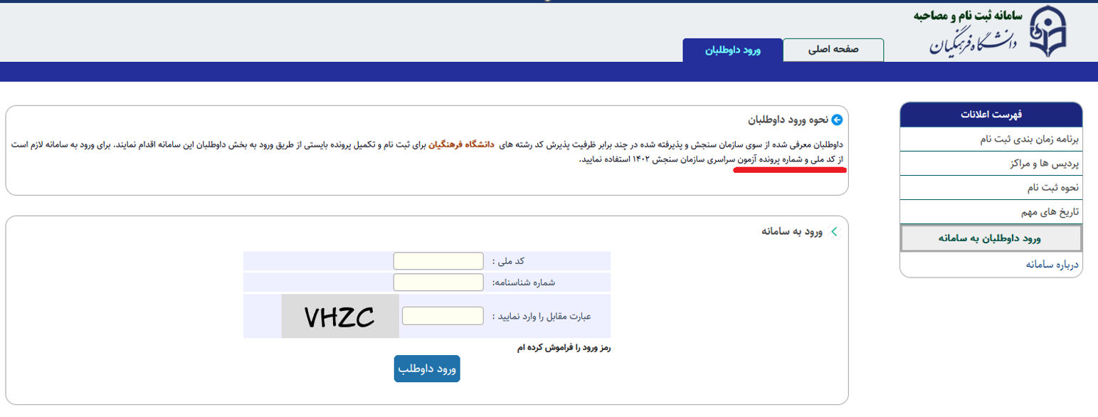 داوطلبان گرامی معرفی شده از سازمان سنجش برای ثبت نام و شرکت در ارزیابی تکمیلی دانشگاه فرهنگیان لازم است با ورود به سامانه ، مراحل زیر را دنبال نمایند: 1- از منوی بالای صفحه روی سربرگ ورود داوطلبان ورود داوطلبان کلیک نمایید. (چنانچه شما از سوی پرتال سازمان سنجش به عنوان داوطلب مجاز جهت شرکت در ارزیابی تخصصی دانشگاه فرهنگیان معرفی شده باشید، می توانید با کد ملی و شماره شناسنامه خود وارد بخش کاربری داوطلبان این سامانه شده و نسبت به تکمیل پرونده و ثبت درخواست اقدام نمایید.)
