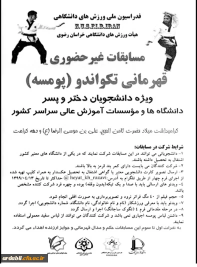 "مسابقات قهرمانی تکواندو در بخش پومسه (دختر و پسر) را به مناسبت گرامیداشت میلاد امام رضا (ع)"