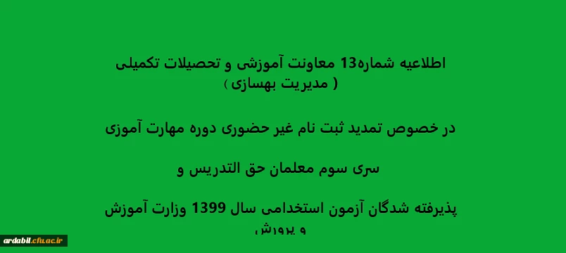اطلاعیه شماره13 معاونت آموزشی و تحصیلات تکمیلی ( مدیریت بهسازی ) در خصوص تمدید ثبت نام غیر حضوری دوره مهارت آموزی سری سوم معلمان حق التدریس وپذیرفته شدگان آزمون استخدامی سال 1399 وزارت آموزش و پرورش