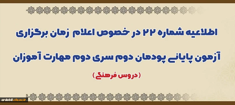 اطلاعیه شماره 22 در خصوص اعلام زمان برگزاری آزمون پایانی پودمان دوم سری دوم مهارت آموزان (دروس فرهنگی)