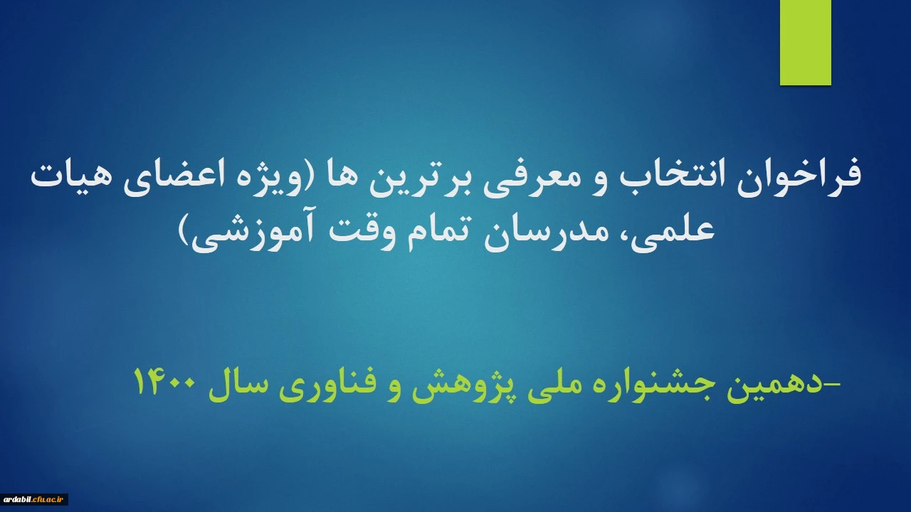 فراخوان انتخاب و معرفی برترین ها (ویژه اعضای هیات علمی، مدرسان تمام وقت آموزشی) ویژه دهمین جشنواره ملی پژوهش و فناوری دانشگاه فرهنگیان - سال 1400
