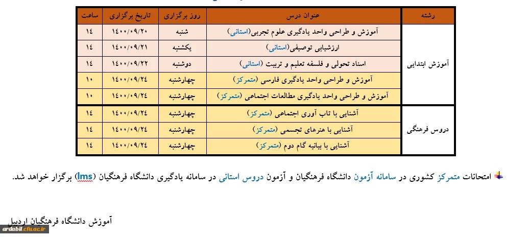 برنامه امتحانات استانی و متمرکز دروس پودمان اول مهارت آموزان «سری چهارم و جاماندگان سری های قبل» و «تجدیدگزینشی های آزمون استخدامی سال 99 و جاماندگان سنوات قبل»
