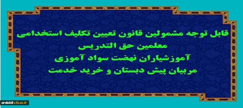 قابل توجه مشمولین قانون تعیین تکلیف استخدامی معلمین حق التدریس، آموزشیاران نهضت سواد آموزی، مربیان پیش دبستان و خرید خدمت آموزش و پرورش