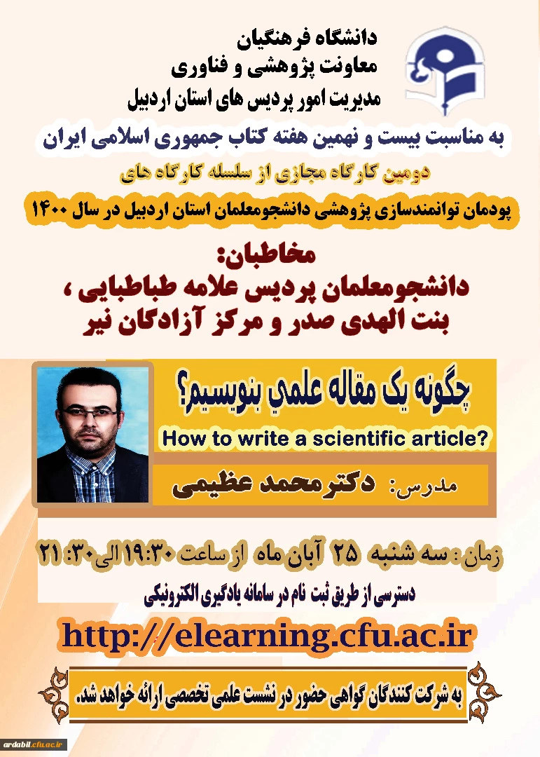 امتیاز دهید : برگزاری کارگاه ها و نشست های علمی و تخصصی پژوهشی در دانشگاه فرهنگیان اردبیل 3 سهشنبه 16 آذر 1400 ساعت 17:25
