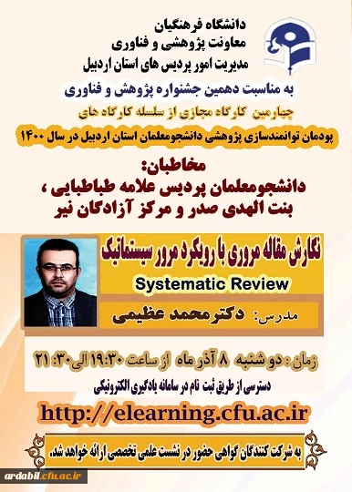 امتیاز دهید : برگزاری کارگاه ها و نشست های علمی و تخصصی پژوهشی در دانشگاه فرهنگیان اردبیل 4 سهشنبه 16 آذر 1400 ساعت 17:25
