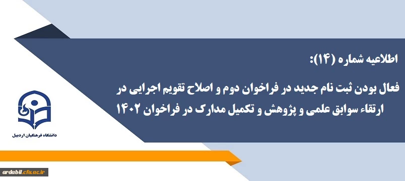 اطلاعیه شماره (14): فعال بودن ثبت نام جدید در فراخوان دوم و اصلاح تقویم اجرایی در ارتقاء سوابق علمی و پژوهش و تکمیل مدارک در فراخوان 1402