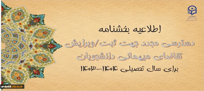 امتیاز دهید : امکان دسترسی مجدد جهت ثبت و ویرایش میهمانی دانشجومعلمان برای سال تحصیلی ۱۴۰۴- شنبه 23 تیر 1403 ساعت 7:19