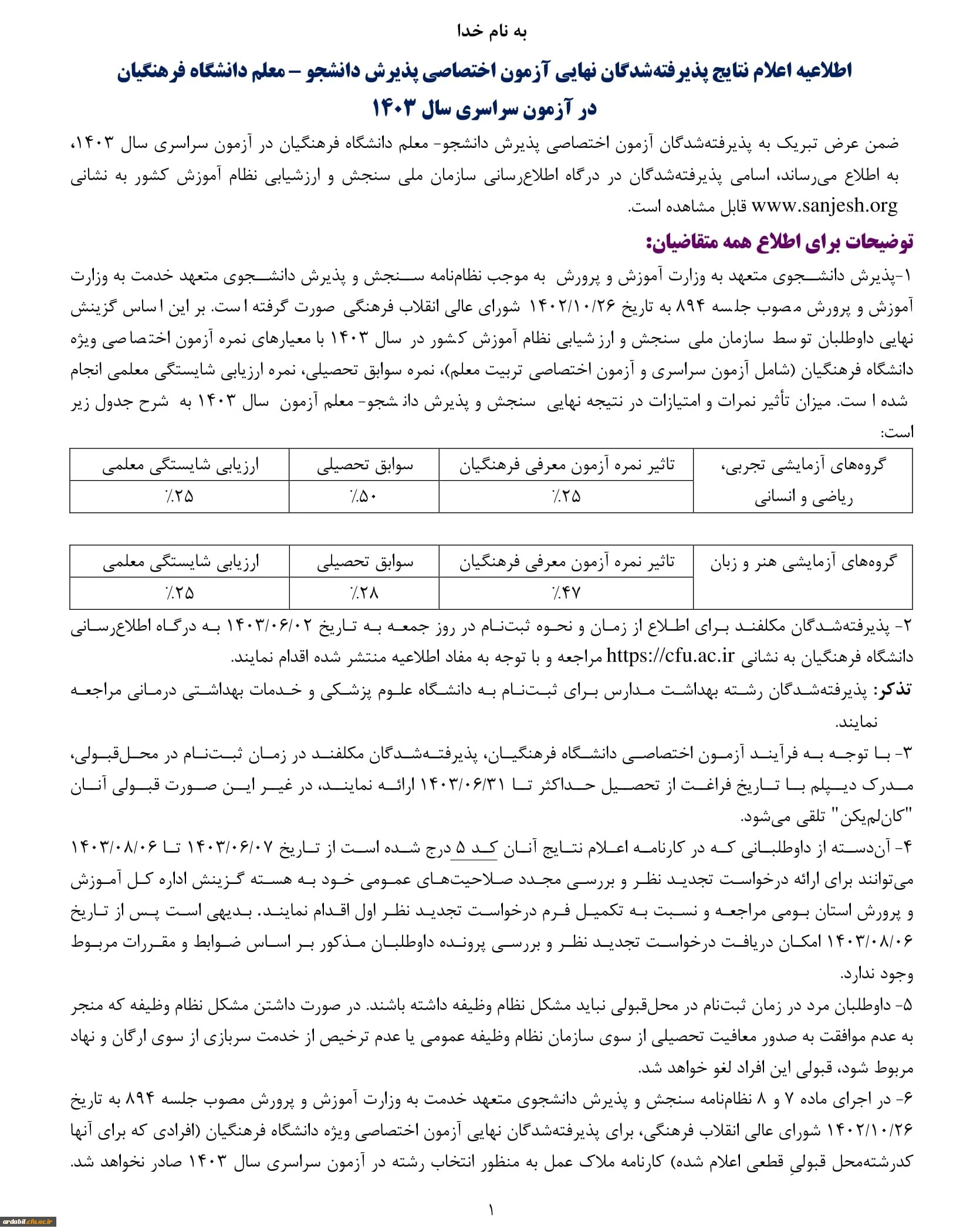 اعلام نتایج پذیرفته شدگان نهایی آزمون اختصاصی پذیرش دانشجومعلم دانشگاه فرهنگیان در آزمون سراسری سال ۱۴۰۳