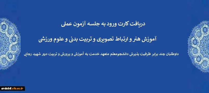 دریافت کارت ورود به جلسه آزمون عملی آموزش هنر و ارتباط تصویری و تربیت بدنی و علوم ورزشی داوطلبان چند برابر ظرفیت پذیرش دانشجومعلم متعهد خدمت به آموزش و پرورش و تربیت دبیر شهید رجایی